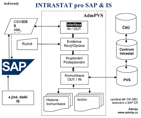 Implementace s SAP aj. ERP IS.Elektronická podání statistických hlášení (viz. SCHÉMA /POPIS)celní správě ČR (SR), centru Intrastat, Českému statistickému úřadu prostřednictvím sw aplikace AdmPVS přes Portál veřejné správy (IDES).